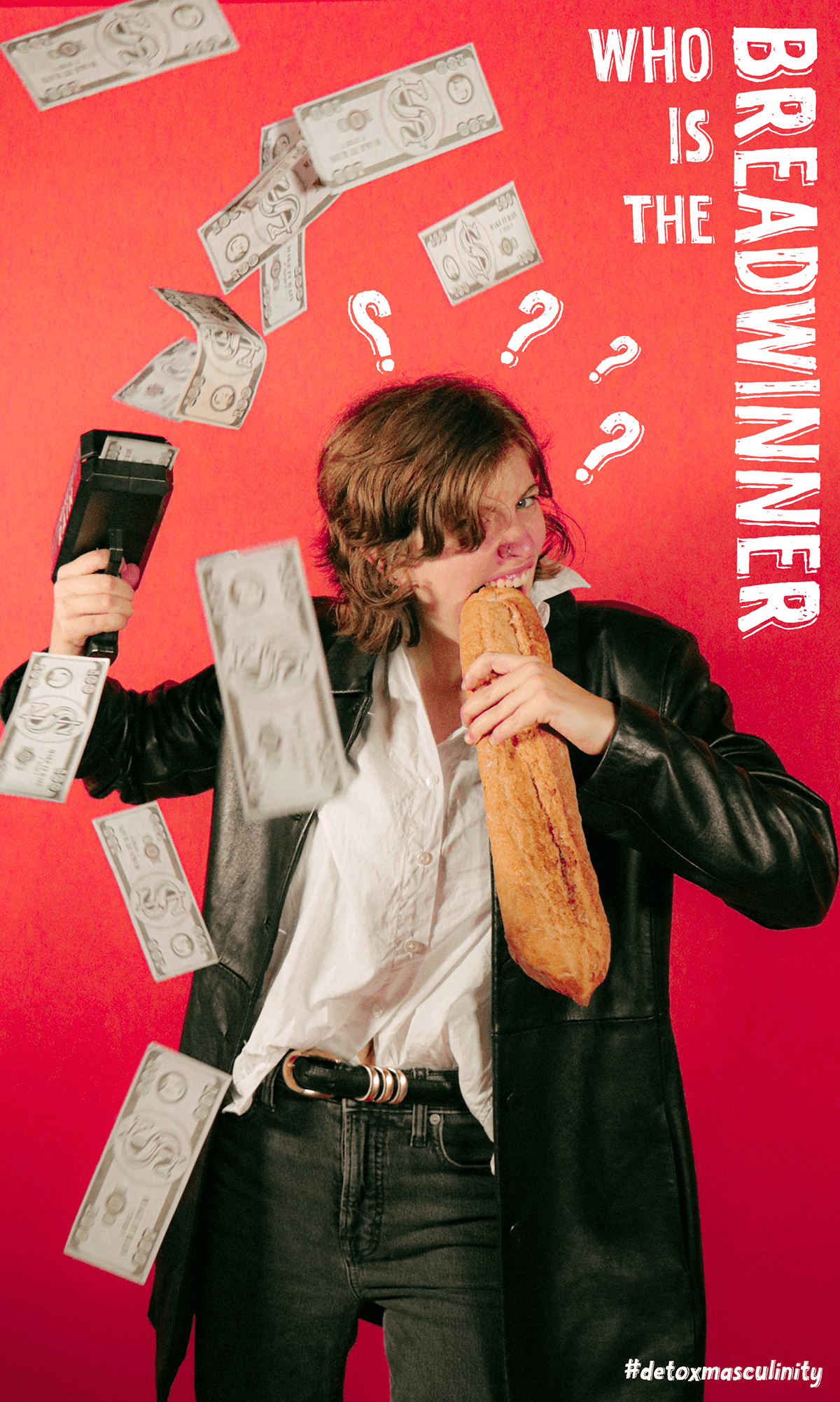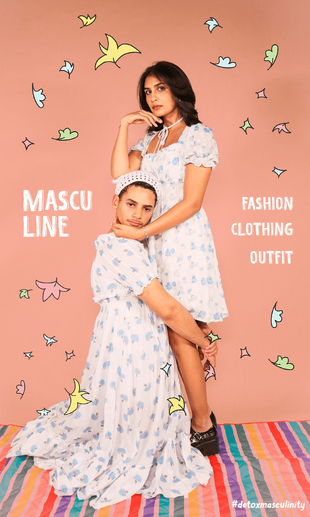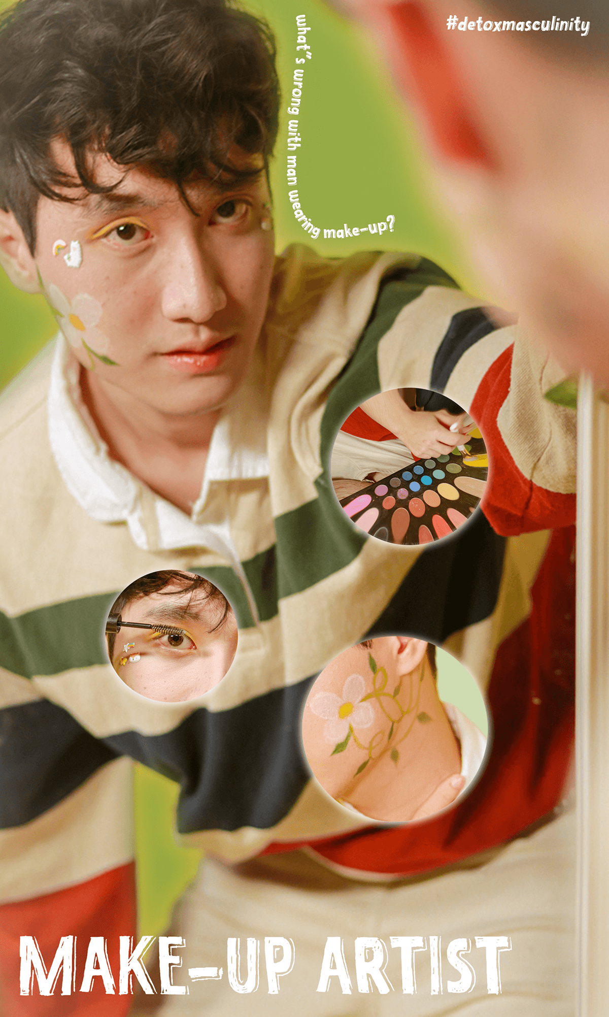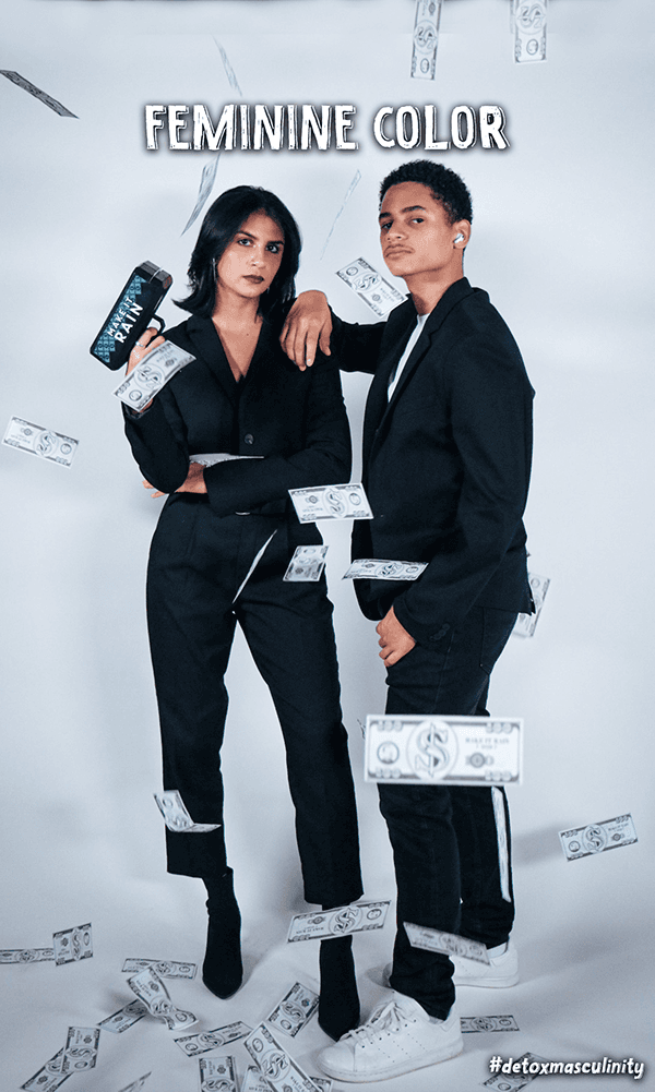 DETOX MASCULINITY, right in its name, is to detox toxic masculinity, challenging the term by showing the reverse of a set of attitudes and ways of behaving stereotypically that society expects of men and women. Through photography and graphic design, I created a series of personas that embody these reversed attitudes.