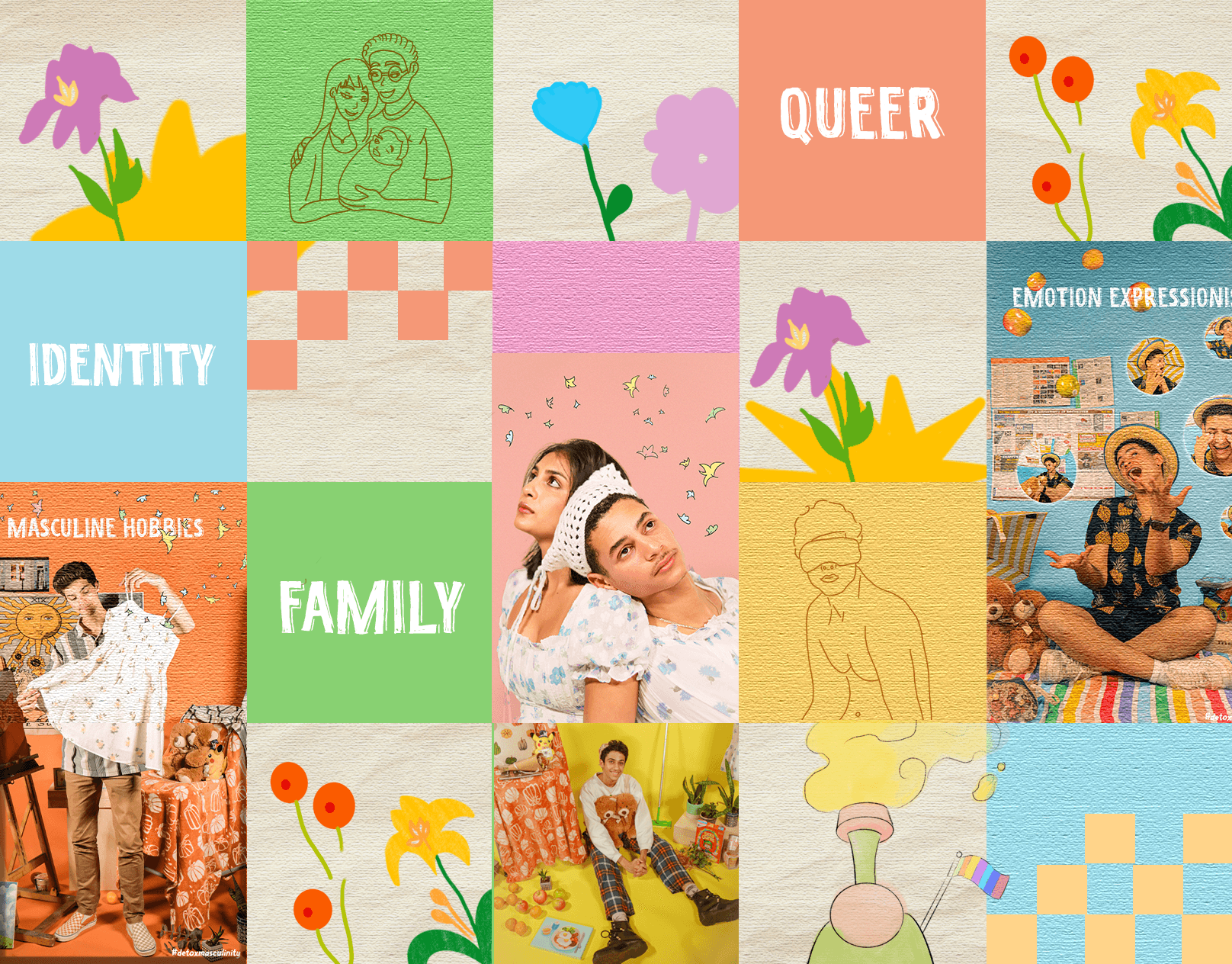 A collective showcase from DMST103: Essential Digital Media Toolkit class. The themes being explored in these projects are queerness, toxic masculinity, and family.