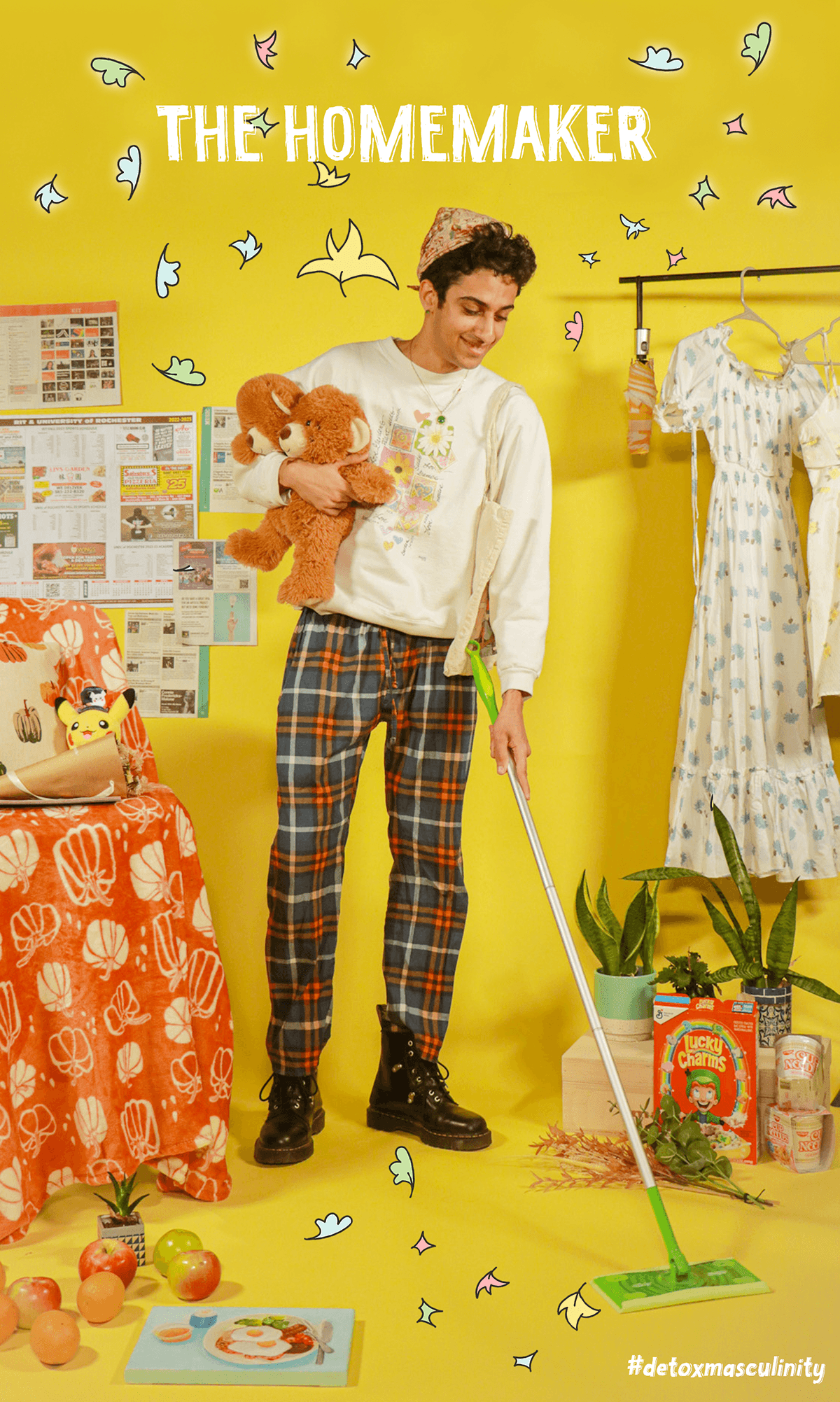 DETOX MASCULINITY, right in its name, is to detox toxic masculinity, challenging the term by showing the reverse of a set of attitudes and ways of behaving stereotypically that society expects of men and women. Through photography and graphic design, I created a series of personas that embody these reversed attitudes. Rooted in my personal experiences growing up in a country where female and LGBTQ+ rights are not fully recognized, this project draws from years of observation and reflection. I use playful, colorful visuals as a way to confront heavy social issues with approachability, optimism, and intention.